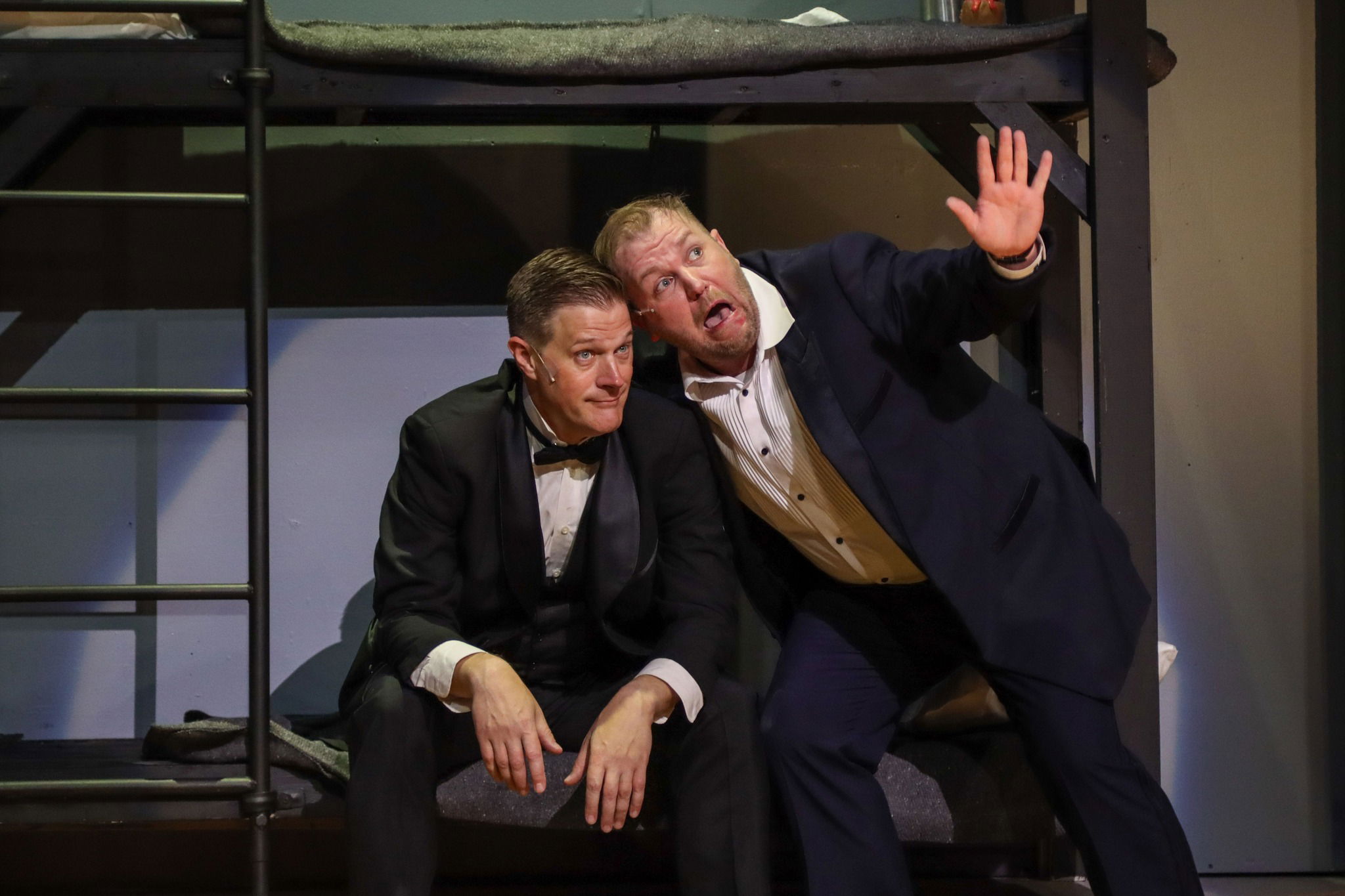 (Photo: Mike Ross as “Billy Crocker” listens to Thom Hardy philosophize as “Moonface Martin,” in a scene from the Cole Porter musical "ANYTHING GOES" now playing at Theatre at the Mount in Gardner, MA. through October 12, 2025. Photo Credit: Paige Fowler Photography)