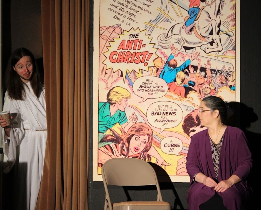 (Photo: Lucas Cardwell as "Jesus" and Cherry Lynn Zinger as “Sylvia” in a scene from Deborah Zoe Laufer's "END DAYS" from City on a Hill Arts now playing in Leominster, MA. through November 15, 2025. Photo Credit: Jen Knight)