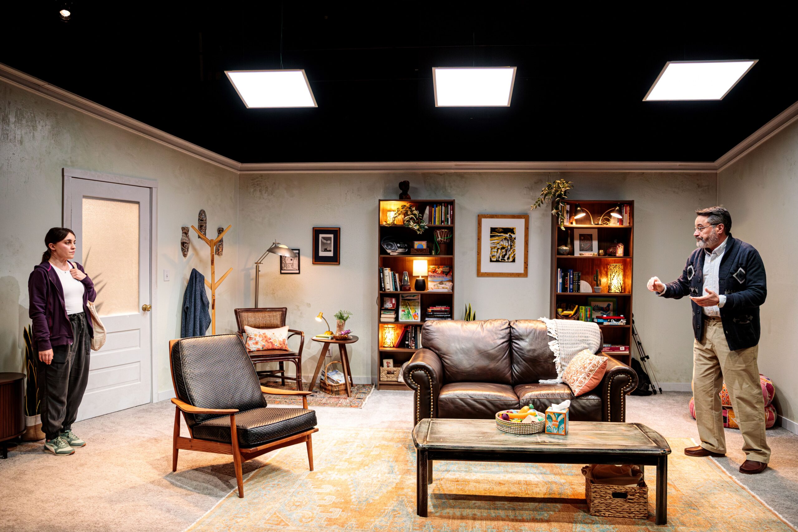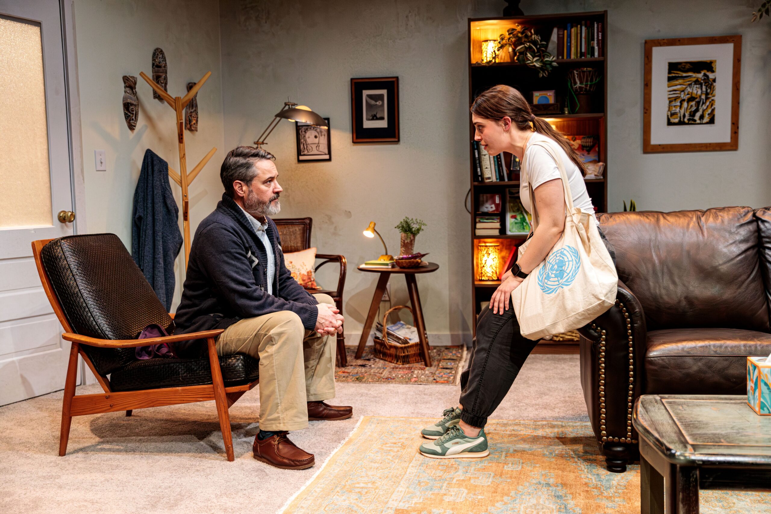 (Photo: Dennis Trainor, Jr. as "Loyd" listens to Josephine Moshiri Elwood as "Jane" in a scene from "JOB" by Max Wolf Friedlich now playing at SpeakEasy Stage Company in Boston, MA. until February 7, 2026. Photo credit: Benjamin Rose Photography)