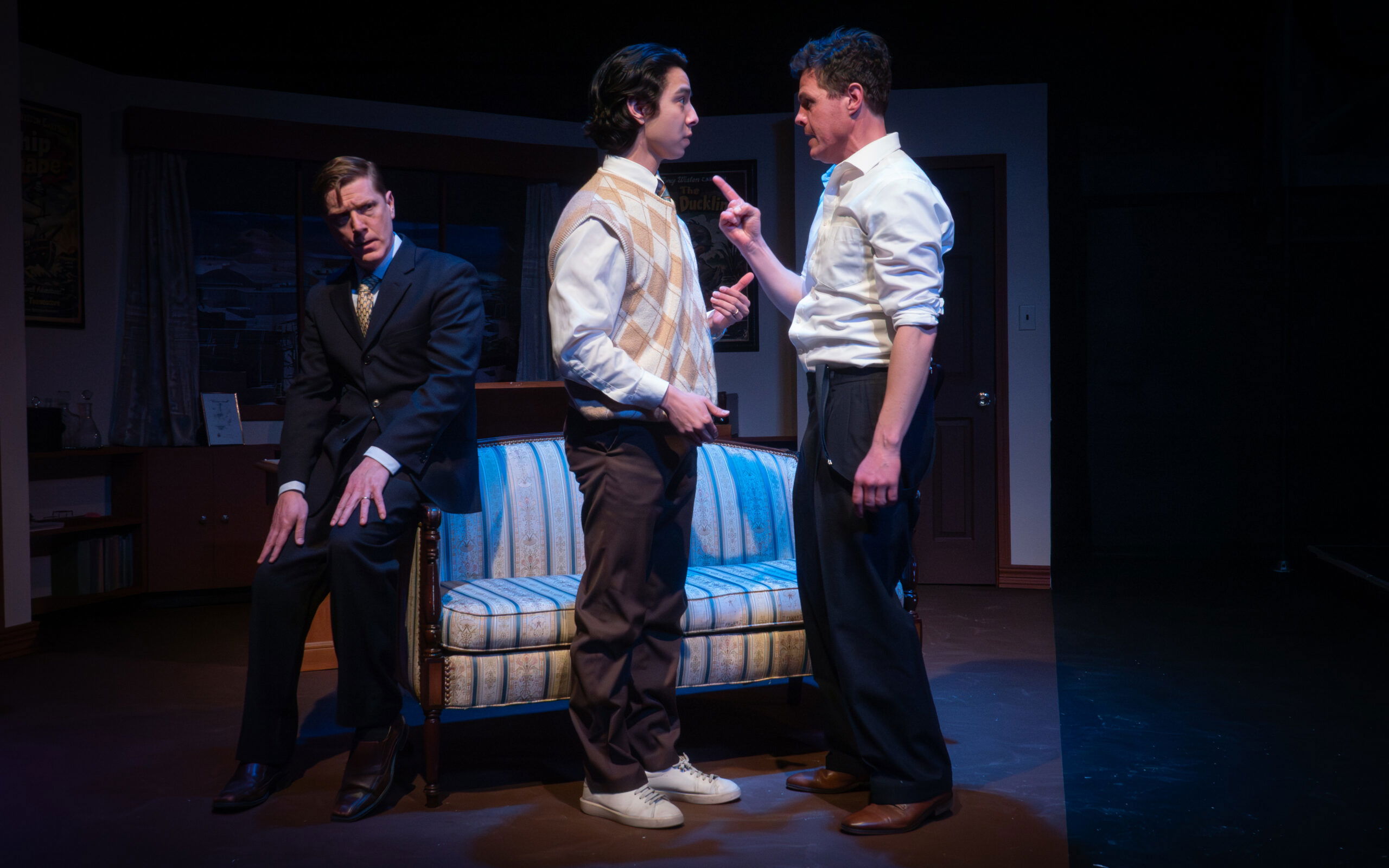 (Photo: Adam Heroux as "Dale Wiston," Nathan Mabanglo-Burgett as "Leo Baxter" and Nick Miller as "Tony Wiston" in a scene from Bruce Graham's "SOMETHING INTANGIBLE" now playing at Quannapowitt Players in Reading, MA. through April 4, 2026. Photo Credit: Jonathan Sachs)