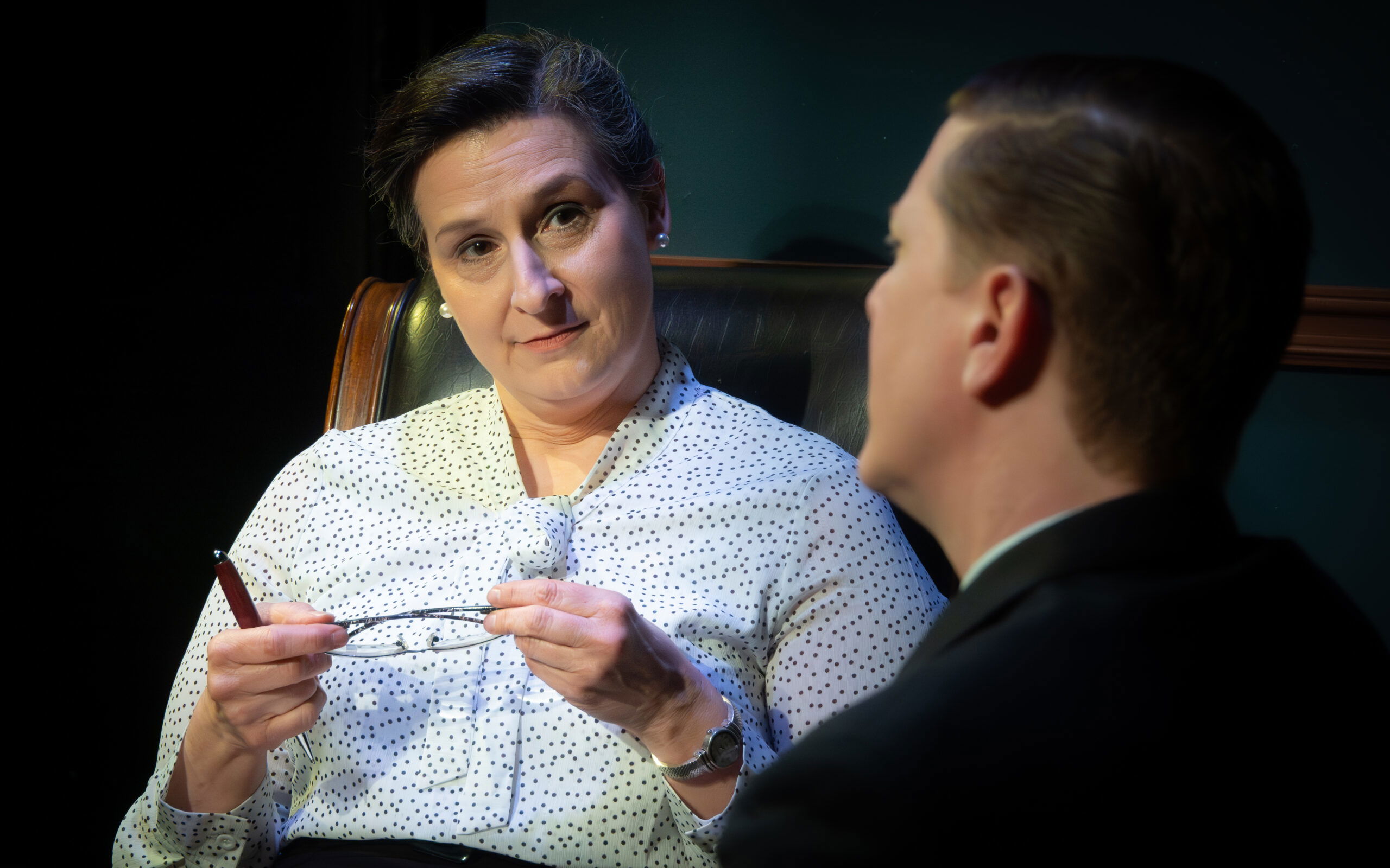 (Photo: Jenny Fielding as "Sonia Feldman" listens to Adam Heroux as "Dale Wiston" in a scene from Bruce Graham's "SOMETHING INTANGIBLE" now playing at Quannapowitt Players in Reading, MA. through April 4, 2026. Photo Credit: Jonathan Sachs)