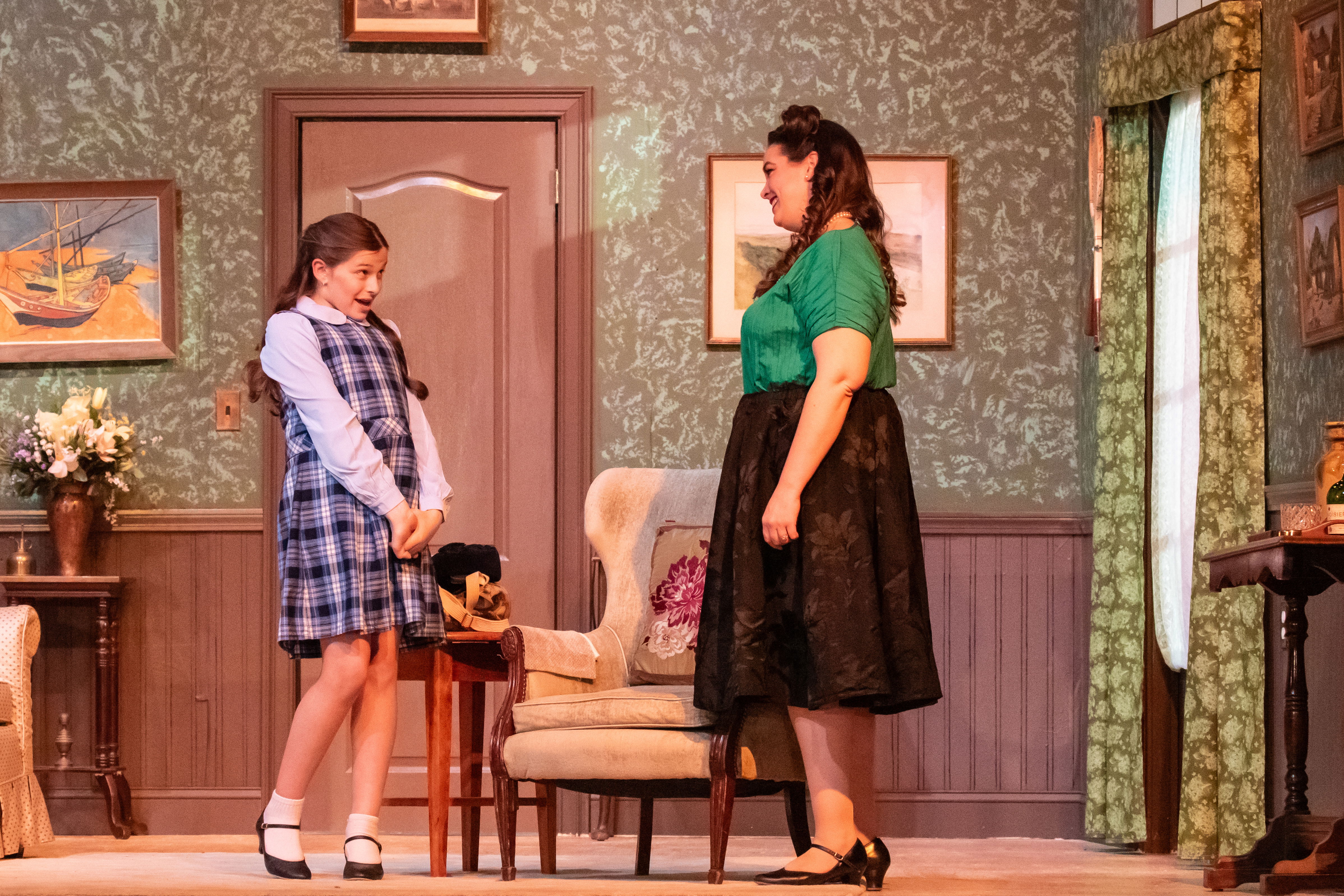 (Photo: Dede Jimenez as “Pippa Hailsham-Brown” with Amy Young as “Clarissa Hailsham-Brown” in a scene from Agatha Christie's "SPIDER'S WEB" now playing at AFD Theatre in Arlington, MA. through December 14, 2025. Photo Credit: Leslie Maiocca)