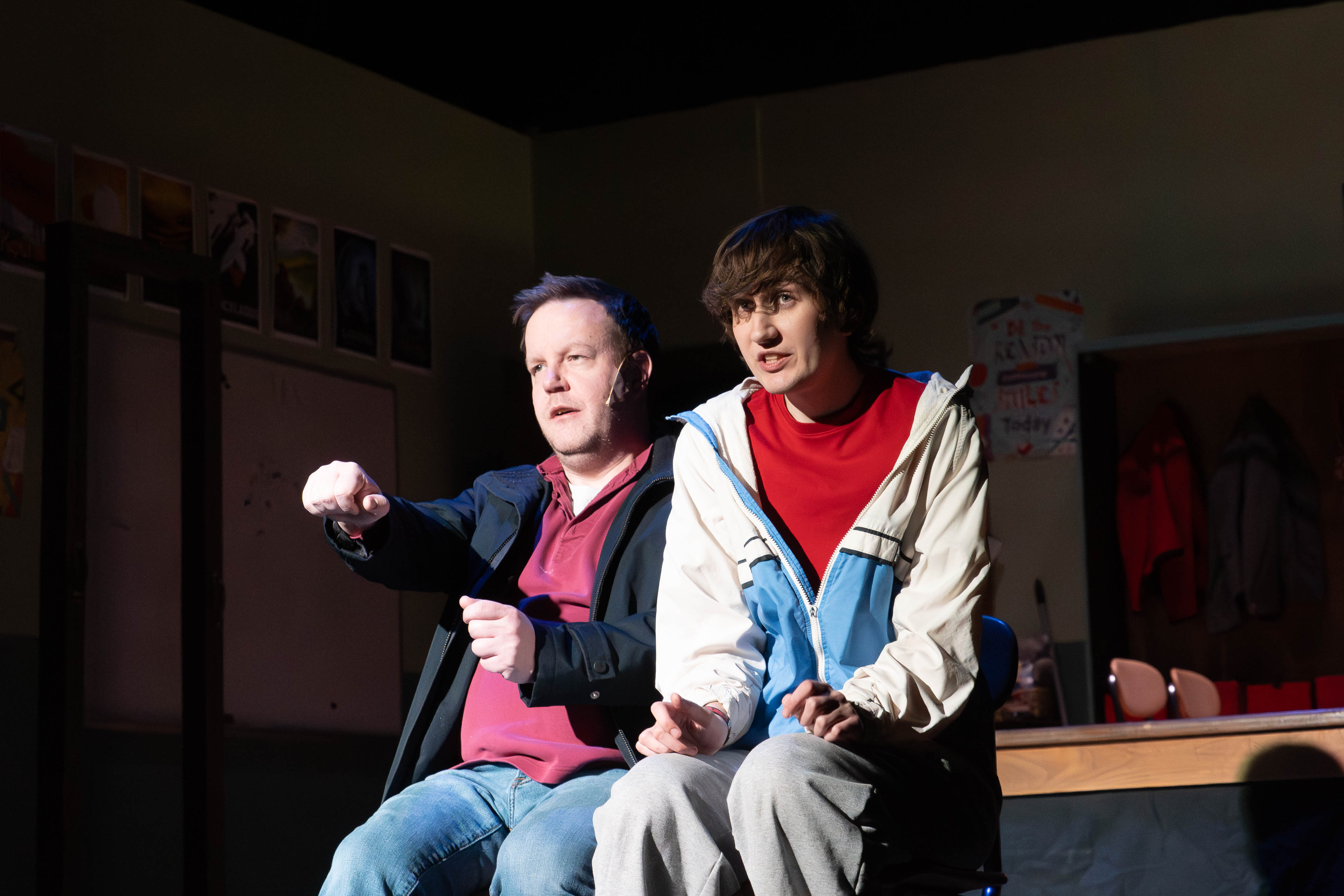 (Photo: Nick Bennett-Zendzian as “Ed” "drives" Finian Ross as “Christopher” in a scene from "THE CURIOUS INCIDENT OF THE DOG IN THE NIGHT-TIME" by Simon Stephens based upon the play by Mark Haddon, presented by Concord Players in Concord, MA. now playing through February 28, 2026. Photo Credit: Chris Pollari)