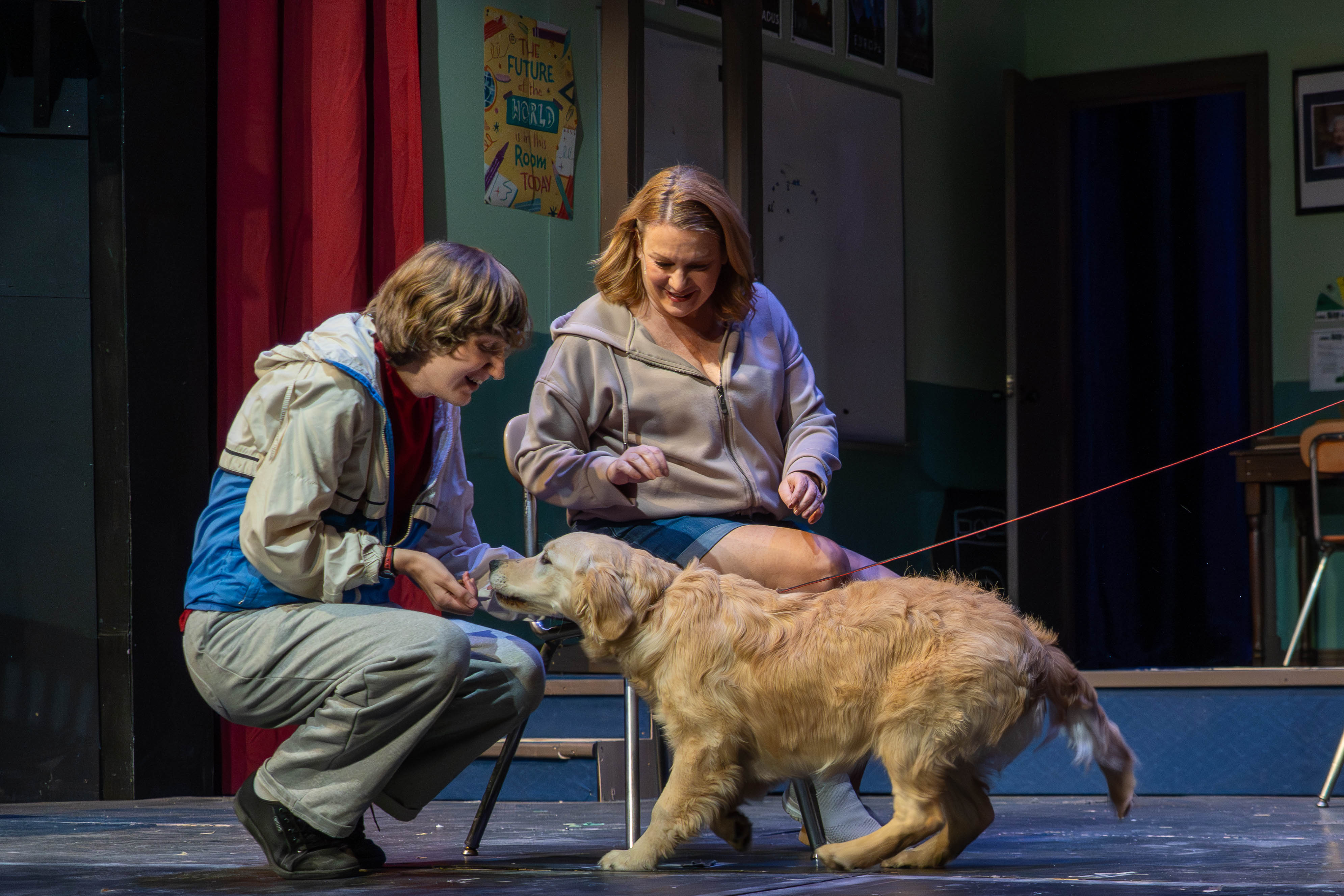 (Photo: Becky Ruccio as “Judy” observes Finian Ross as “Christopher” and "friend" in a scene from "THE CURIOUS INCIDENT OF THE DOG IN THE NIGHT-TIME" by Simon Stephens based upon the play by Mark Haddon, presented by Concord Players in Concord, MA. now playing through February 28, 2026. Photo Credit: Chris Pollari)