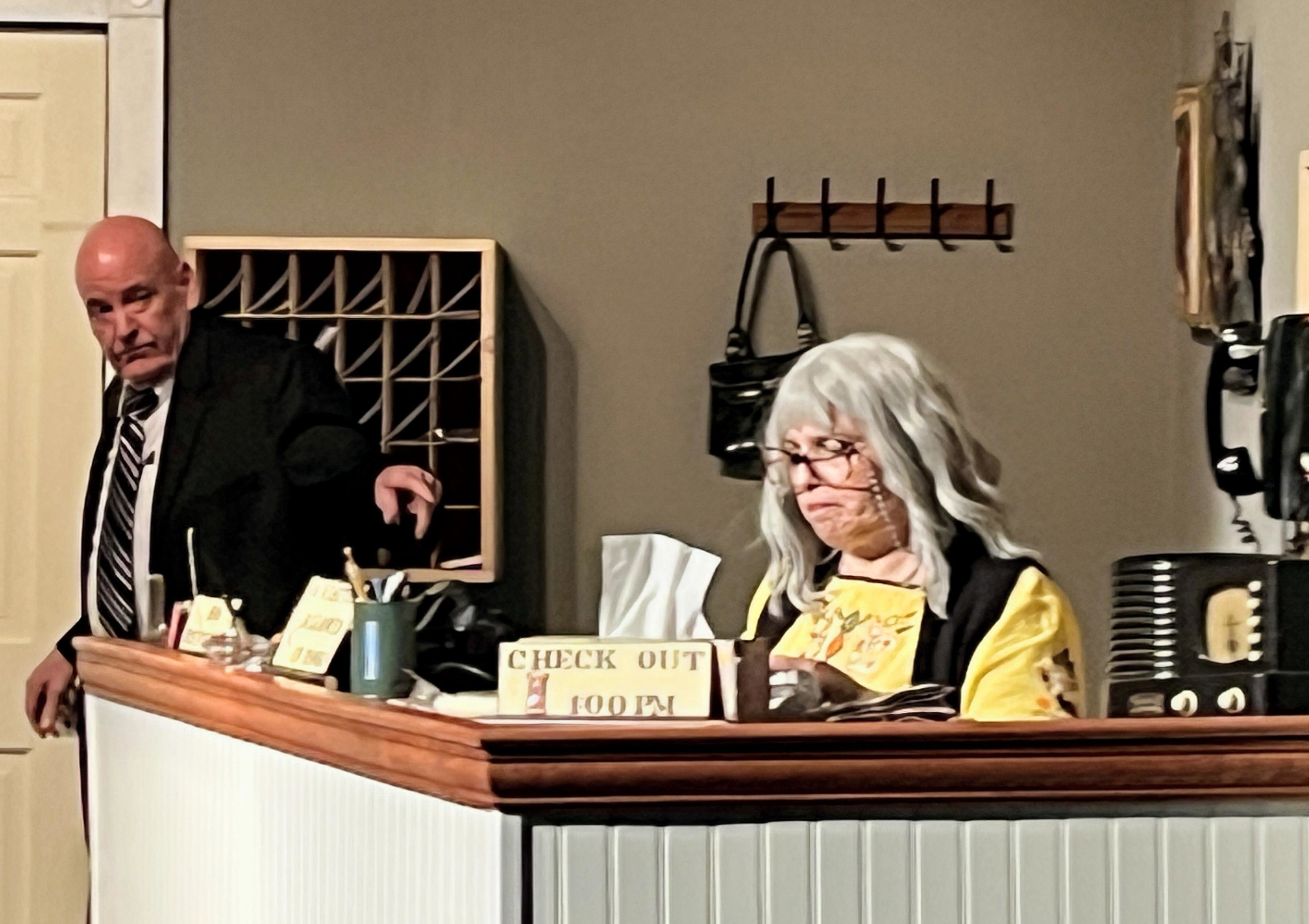 In the Pasture Prime Players staging by director Don Konopacki, the noteworthy set design is mostly kept basic but there is an admirable attempt at an antiquated telephone switchboard circa 1970s but probably was implemented at the hotel in the 50s, that actually lights up.