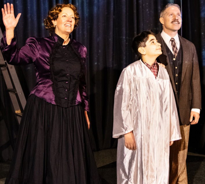 (Photo: Jeanine Belcastro Went as "Esther Goddard," Chris Bardizbanian as "Young Robert/Ensemble" and Ryan Sullivan as "Robert Goddard" in a scene from "THE ROCKET MAN - THE ROBERT GODDARD MUSICAL" by Stephen Murray, from 4th Wall Stage Company in Worcester, MA. now playing through April 4, 2026. Photo Credit: Frank Bartucca frbphoto.com)