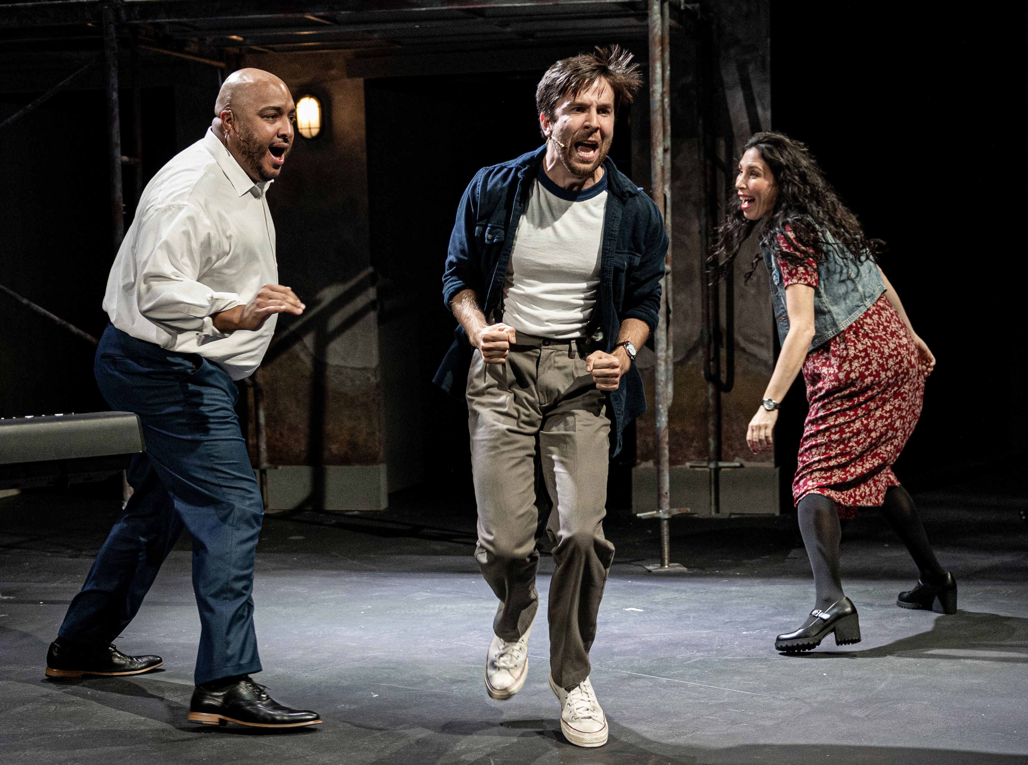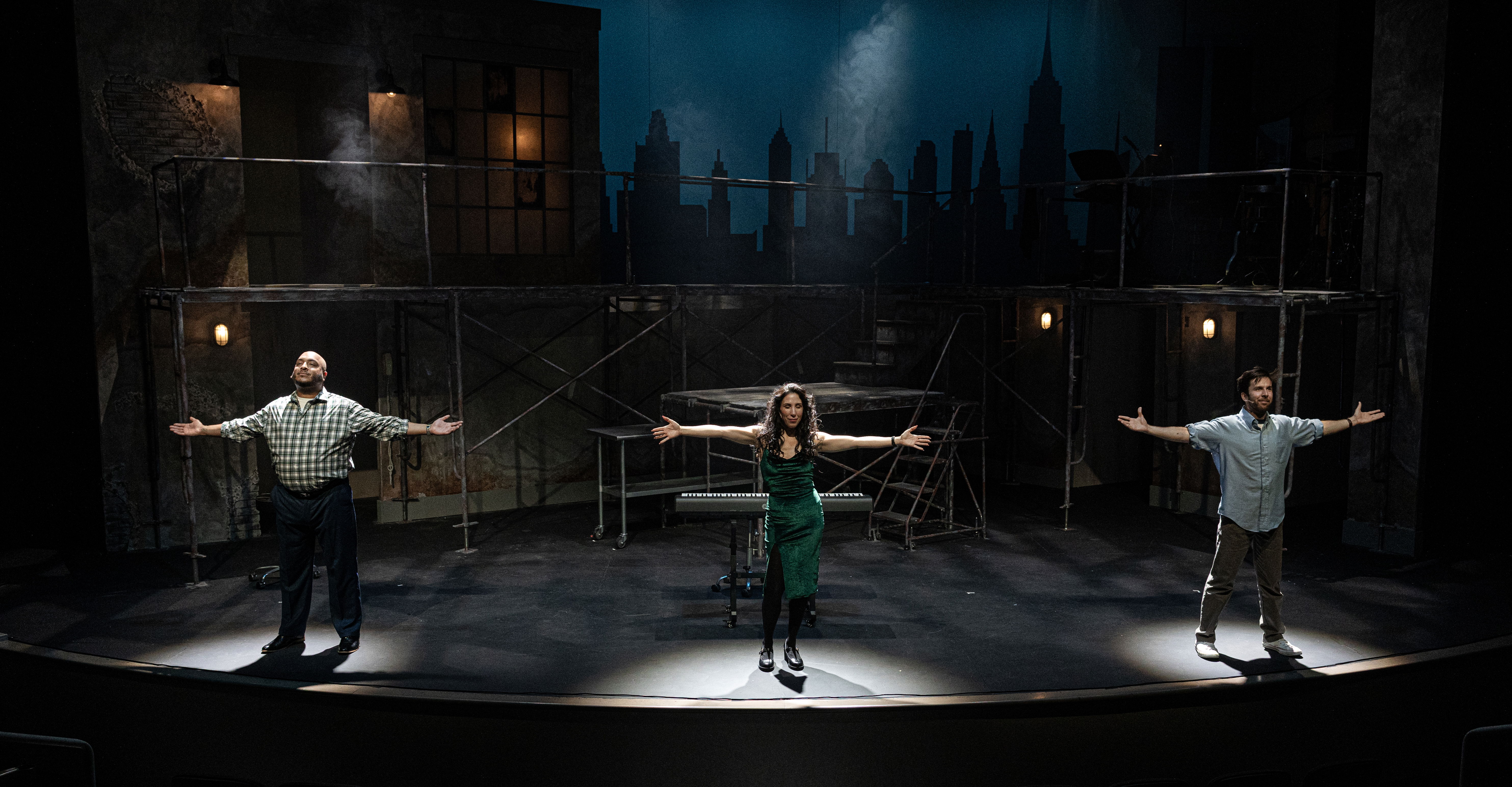 (Photo: Anthony Pires, Jr. as “Michael,” Vanessa Calantropo as “Susan” and Johnny Shea as “Jon” in a moment from the musical "TICK, TICK...BOOM!" by Jonathan Larson, now playing at Umbrella Arts Center in Concord, MA. until November 23, 2025. Photo Credit: Jim Sabitus)