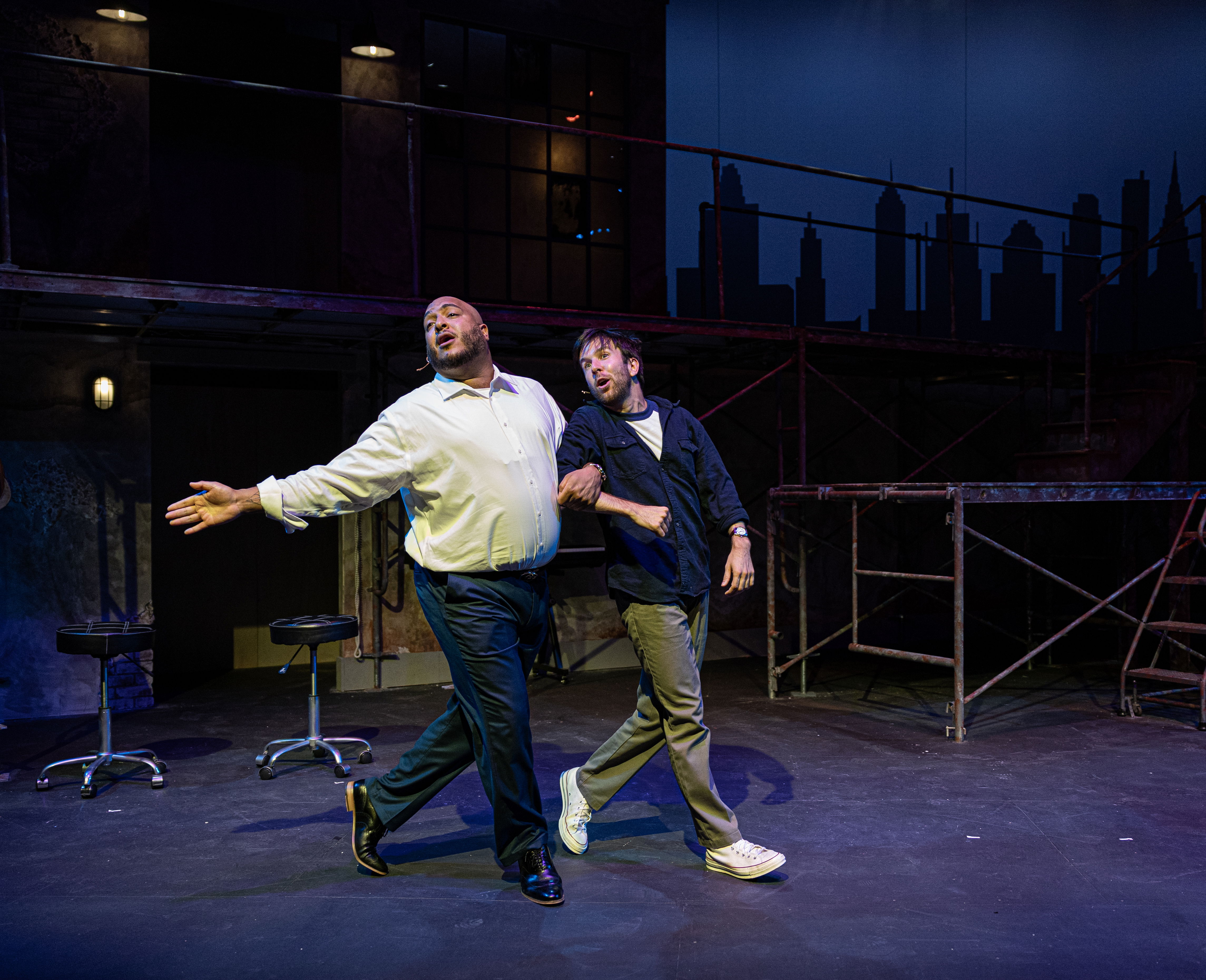 (Photo: Anthony Pires, Jr. as “Michael” with Johnny Shea as “Jon” in a moment from the musical "TICK, TICK...BOOM!" by Jonathan Larson, now playing at Umbrella Arts Center in Concord, MA. until November 23, 2025. Photo Credit: Jim Sabitus)